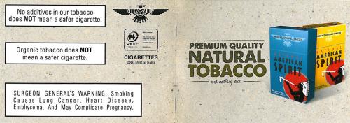 Direct mail from American Spirit received in September 2015 featuring a booklet heavily emphasizing the "additive-free" and "natural" tobacco used in their products, as well as their "sustainable, earth-friendly" farming practices. Includes coupons. "It's tobacco the way nature intended." The paper used is from certified sustainable and recycled sources.