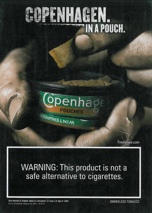 Magazine ad promoting Copenhagen pouches. Image is of a rough male hand removing a pouch from a can.