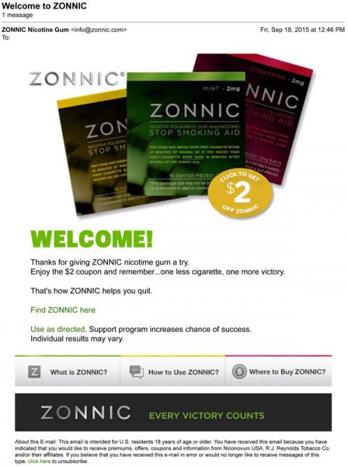 Email from Zonnic nicotine gum welcoming the recipient after signing up for promotional offers on the brand website in September 2015. Links to a printable coupon for 2$ off their product.