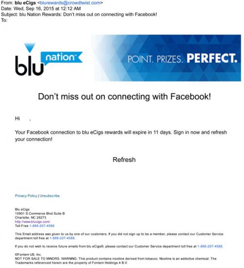 Reminder email from blu Nation Rewards in September 2015 notifying the recipient that their Facebook connection to the rewards program is going to expire soon, and supplying a link to refresh it.