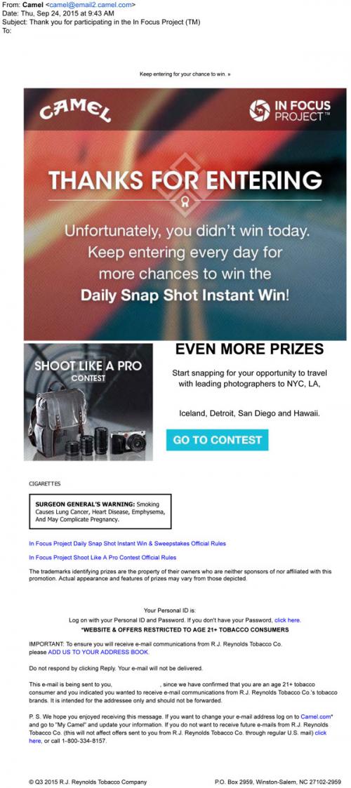 Camel email in September 2015 thanking the recipient for participating in the In Focus Project, which features daily instant win prizes and an ongoing photography competition that aligns with themes for Camel cigarette products.
