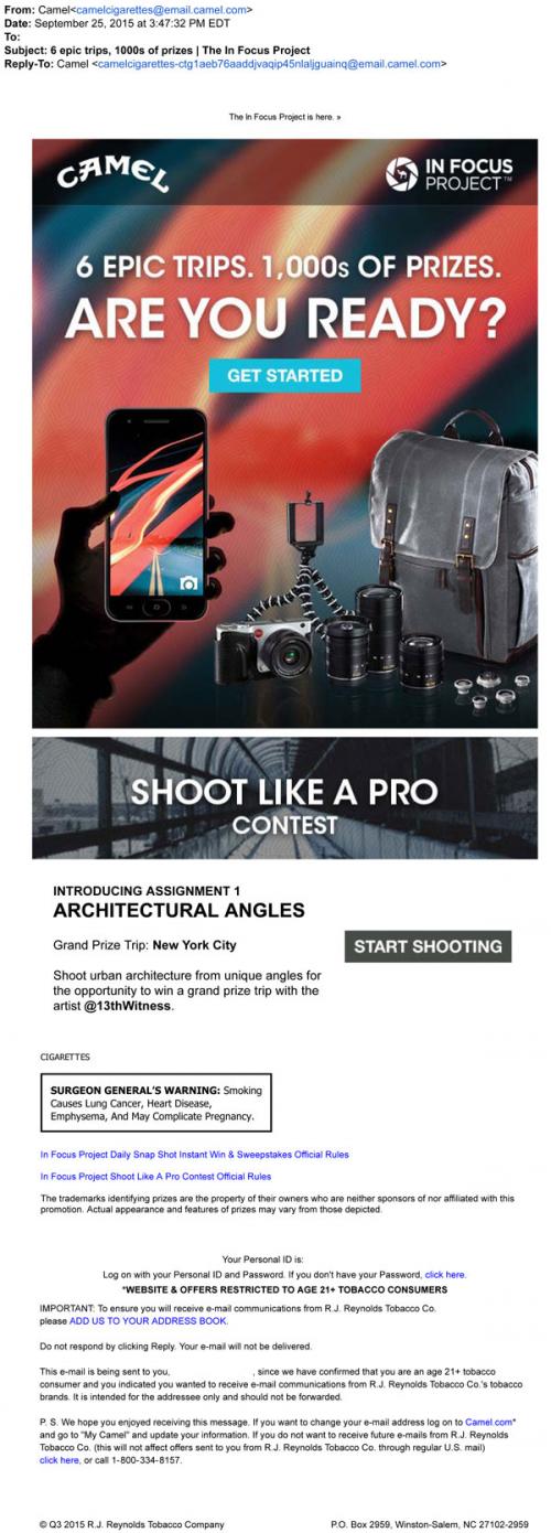 Email promoting the Camel In Focus Project in September 2015, a mobile photography contest held on the brand website for a chance to win photography trips with media professionals, as well as other instant prizes.