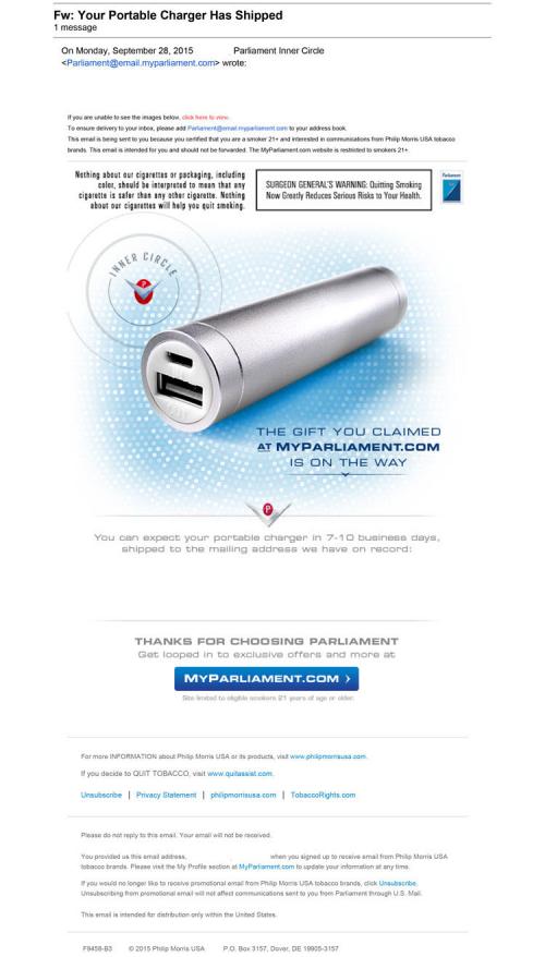 Email received from Parliament September 28, 2015 informing recipient that their free gift has shipped. Recipient claimed a portable charger on the brand website by entering an in-pack code.