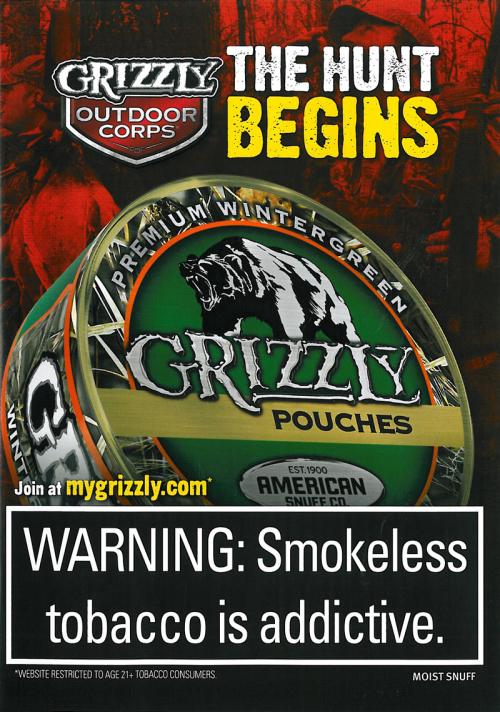 Grizzly double sided magazine ad promoting camo cans. Text: \"The hunt begins. Now in season. Track down Grizzly today.\" Ad found in: Field & Stream: November 2015 Men\'s Journal: November 2015 Outdoor Life: November 2015 Playboy: November 2015