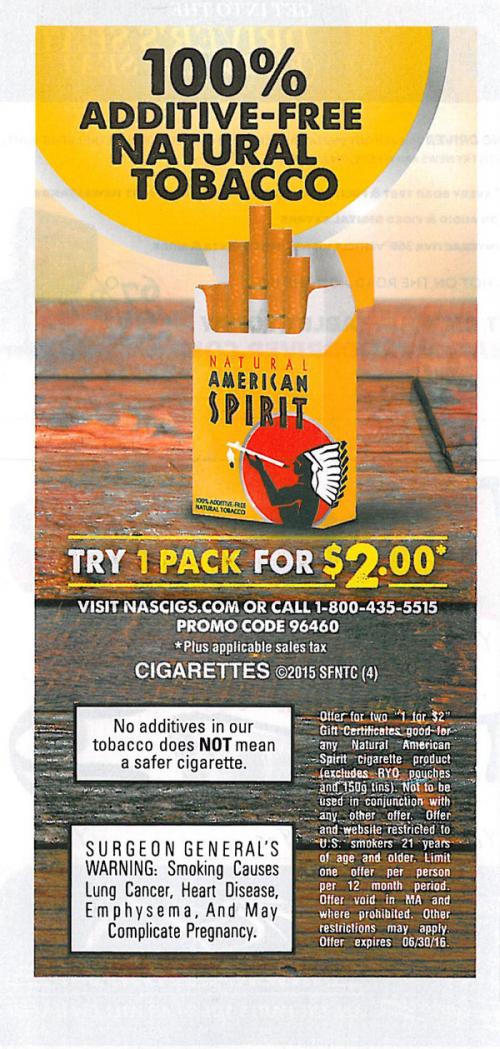 1/2 page American Spirit ad promoting their 100% additive-free natural tobacco. The ad includes a coupon offer that can be claimed by phone or at the brand website with the included promo code.