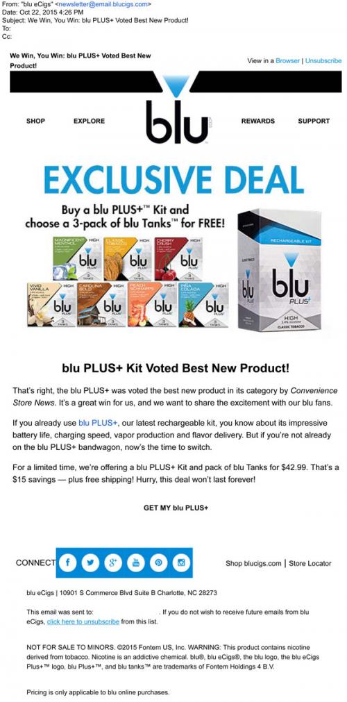 Email from blu in October 2015 with an offer for free tanks with the purchase of a blu PLUS+ kit, their newest rechargeable kit product, in celebration of being voted "Best New Product" by Convenience Store News.