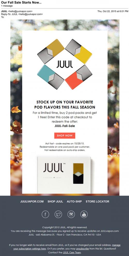 JUUL announces the beginning of their fall sale in October 2015; the featured discount is a free pack of "pod" cartridges with the purchase of two packs.