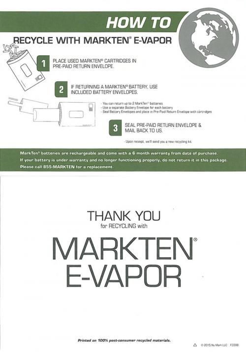 MarkTen sent direct mail in October 2015 similar to one sent in 2014, a pre-paid return envelope for the purpose of recycling cartridges and batteries. They have slightly changed the instructional card included, however: now there is an image of only a globe, and only 2 battery envelopes are included.