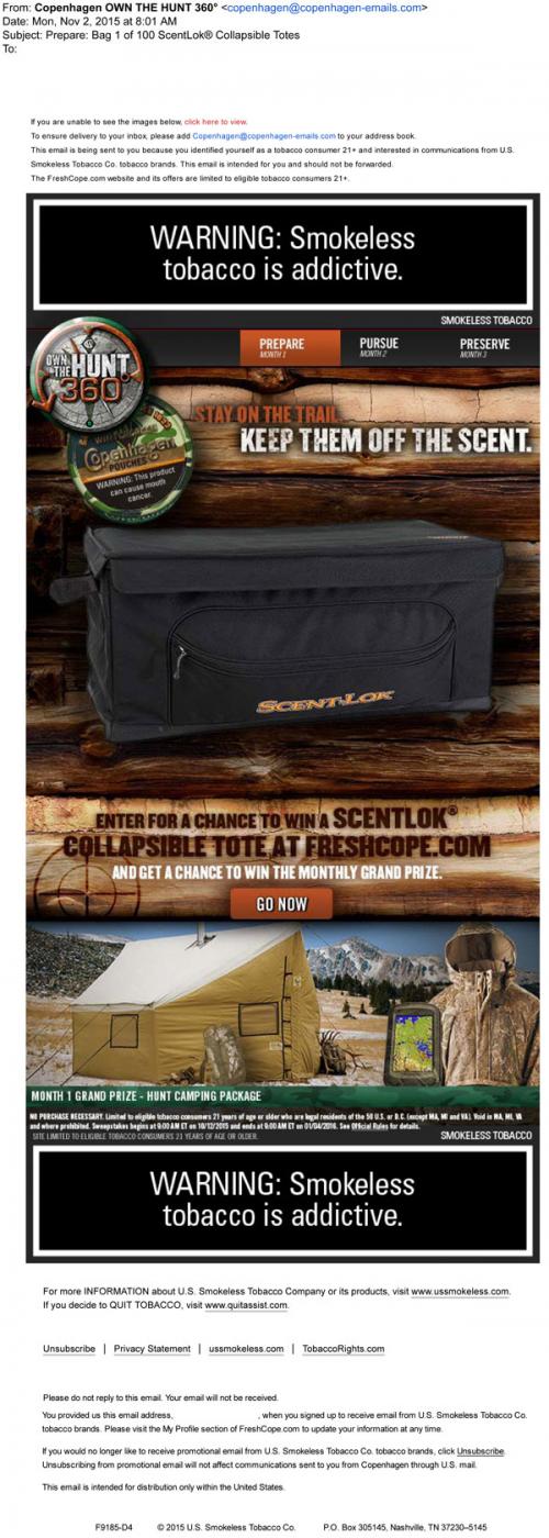 Copenhagen email from November 2015 featuring the latest hunting gear available to win in the Own the Hunt 360 sweepstakes, and how to enter on the brand website.