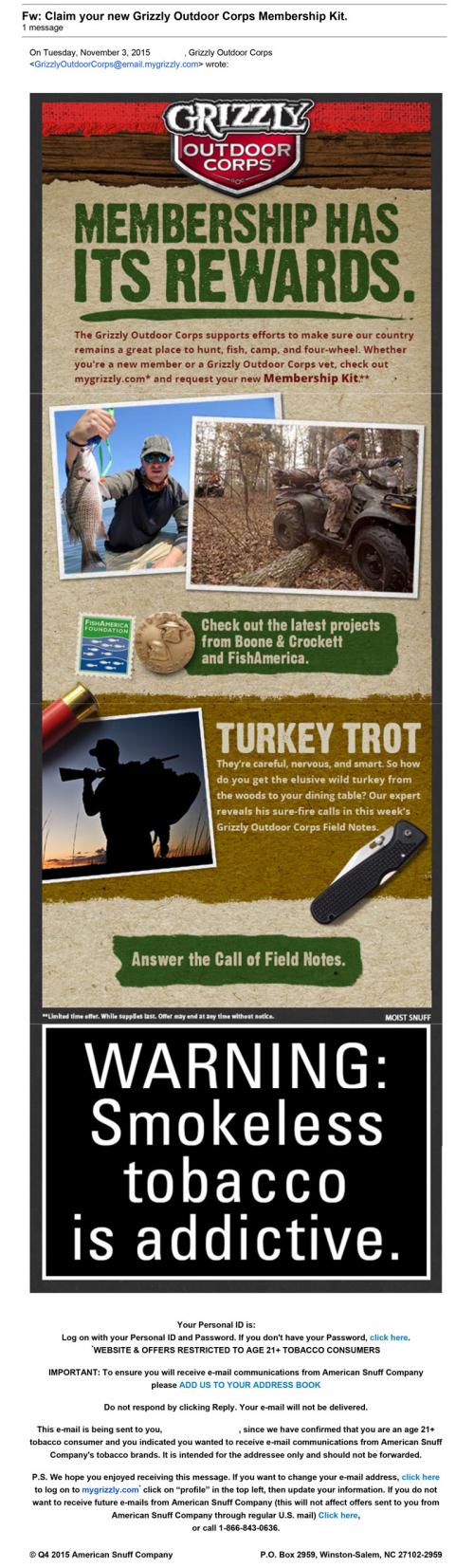 Email received from the Grizzly Outdoor Corps in November 2015 reminding users to claim their membership kit online at MyGrizzly.com and to check out the latest Outdoor Corps projects. Text: "Membership has its rewards."