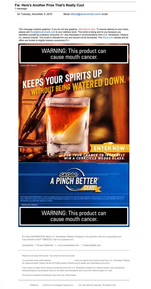 E-mail Promotions-Promo items/Gifts Smokeless Tobacco Sweepstakes