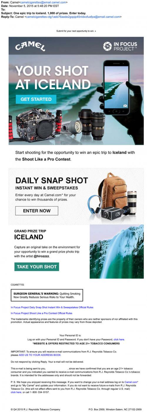 Camel email from November 2015 promoting the In Focus Project and the grand prize photo trip to Iceland. Participants have the chance to win daily prizes on the brand website.