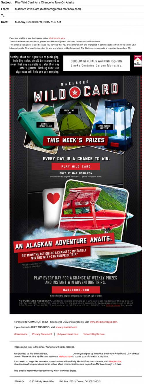Marlboro email from November 2015 features this week's prizes from the Wild Card game, with daily chances to win. The weekly grand prize is a trip to Alaska.