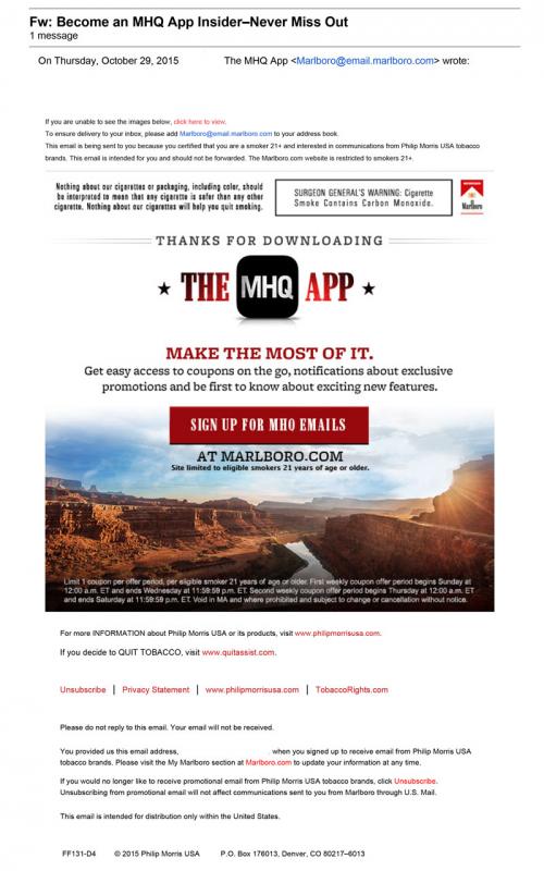 Email received from Marlboro in November 2015 thanking the receiver for downloading the new MHQ App on their mobile device. The email invites recipient to sign up for MHQ emails on the brand website and become an MHQ App Insider.