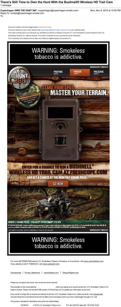Copenhagen email in November 2015 promoting the Own the Hunt 360 sweepstakes with the next round of hunting-themed prizes, a wireless game camera and an ATV.