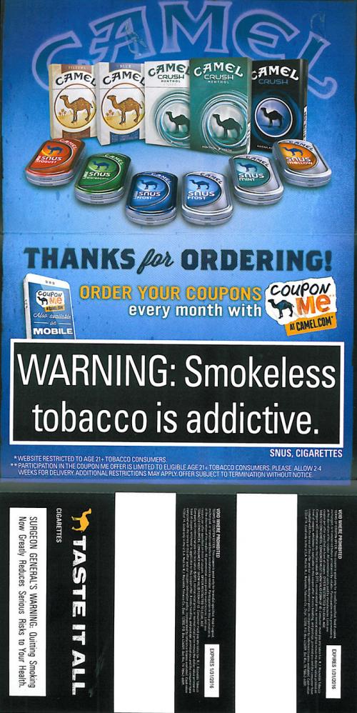 Coupons for Camel cigarettes and snus in direct mail delivered October 2015 as requested on the brand website.
