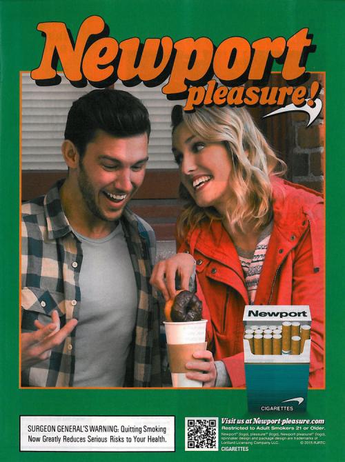 Newport ad featuring a couple having coffee and doughnuts together. Text: " Newport pleasure!" Ad found in: Entertainment Weekly: November 13, 2015