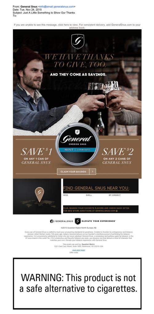 Thanksgiving themed email received from General Snus on November 24, 2015. The email provides a link to the brand website were users can claim their Thanksgiving day coupons. Text"We have thanks to give, too. And they come as savings."