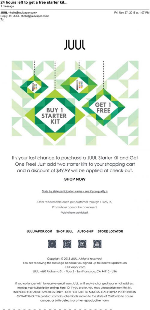 JUUL email sent November 2015 as part of a Black Friday sale promotion to buy one starter kit and get a second for free on the brand website.