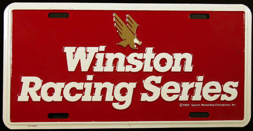 Red and white license plate "Winston Racing Series" along with the gold winston eagle.