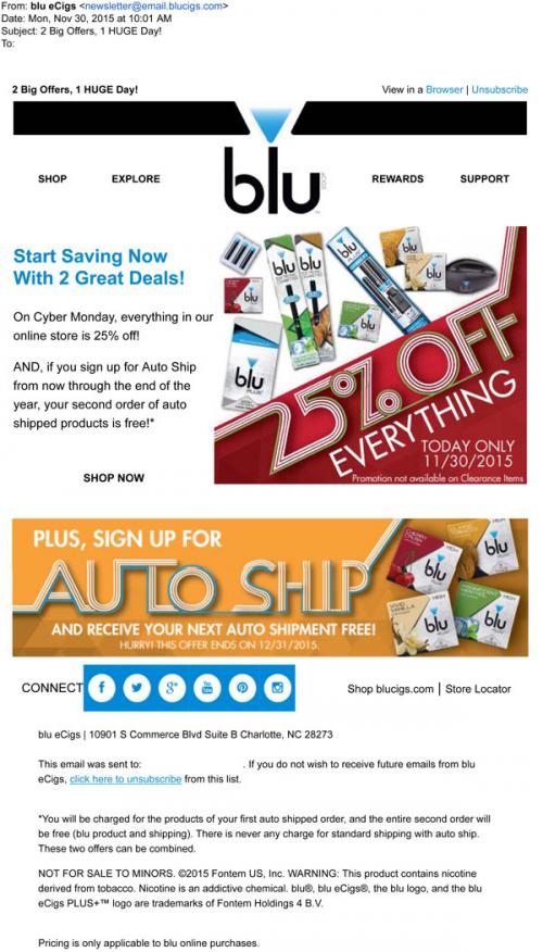 Email from Blu in November 2015 promoting a Cyber Monday sale at the brand website, including a discount promotion for a free auto shipment.