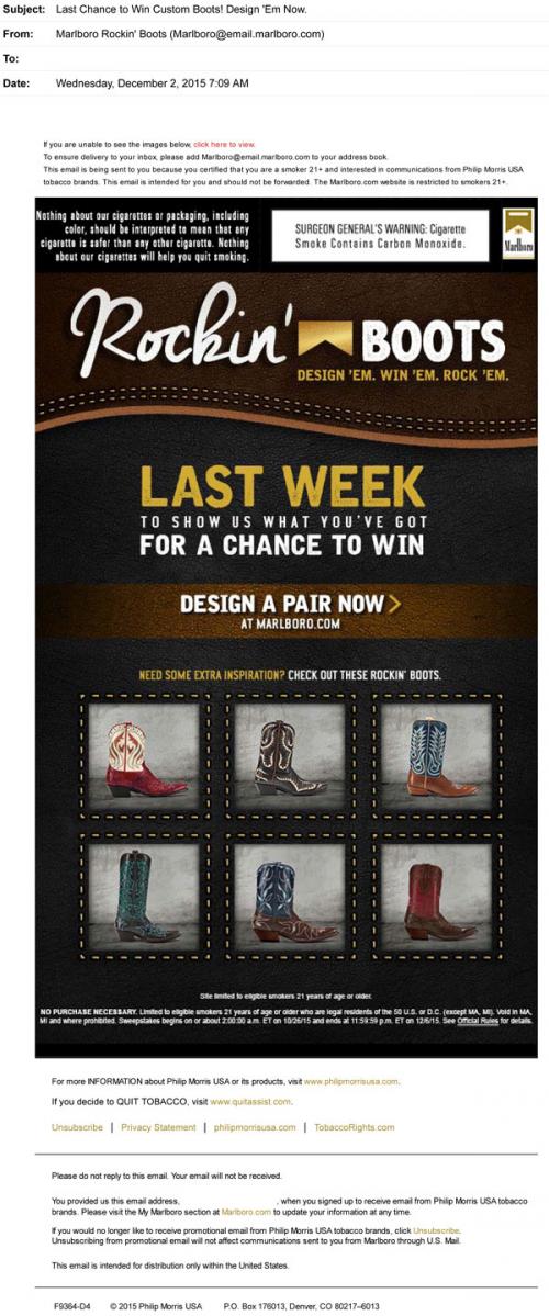 Marlboro email from December 2015 reminding the recipient that it is the last week to enter in the Rockin' Boots design contest for the chance to win some cowboy boots.