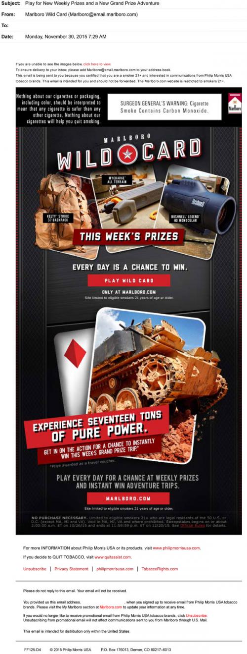 Email from Marlboro in November 2015 promoting the current weekly prizes in the Wild Card sweepstakes.