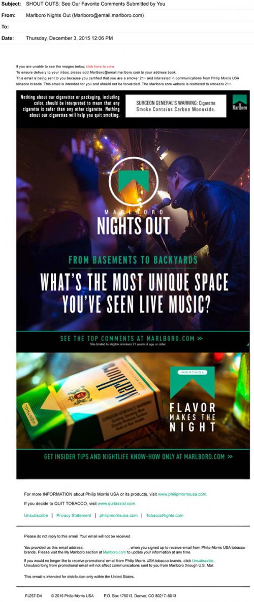 Email from Marlboro Menthol in December 2015 featuring an interactive discussion on the brand website, asking "What's the most unique space you've seen live music?" Also links to more nightlife tips on the website.