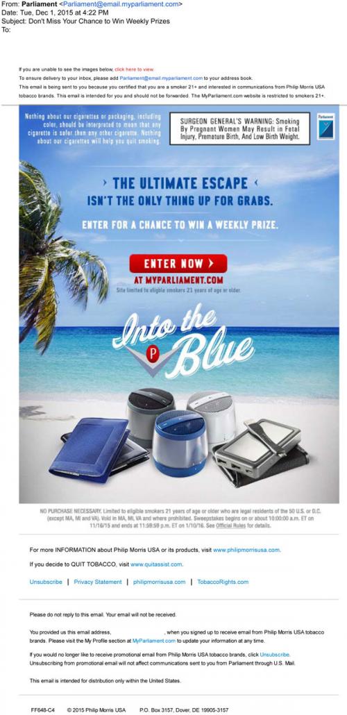 Parliament email from December 2015 reminding the recipient to enter weekly in the Into the Blue sweepstakes in order to win the weekly prizes.