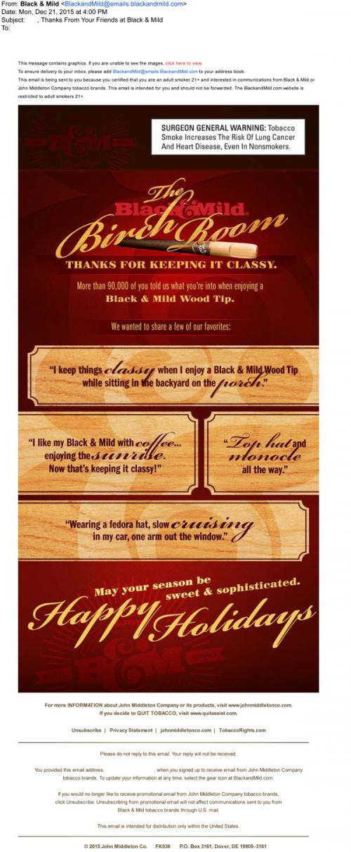 Black & Mild email from December 2015 promoting their wood tip products with a "thanks for keeping it classy." Includes customer quotes about how they enjoy the product. Includes a wish for the recipient to have a Happy Holidays.