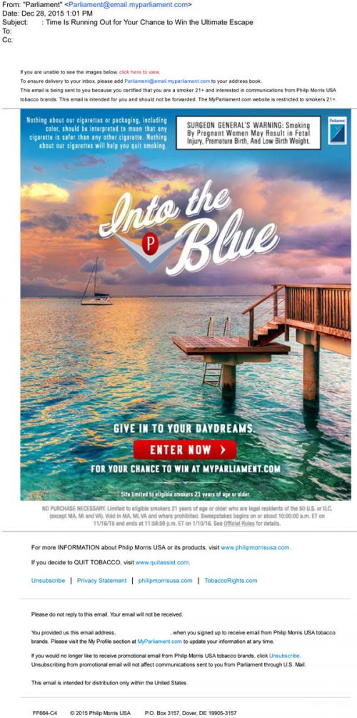 Parliament email from December 2015 with a reminder to enter the Into the Blue sweepstakes. Provides a link to the brand website.