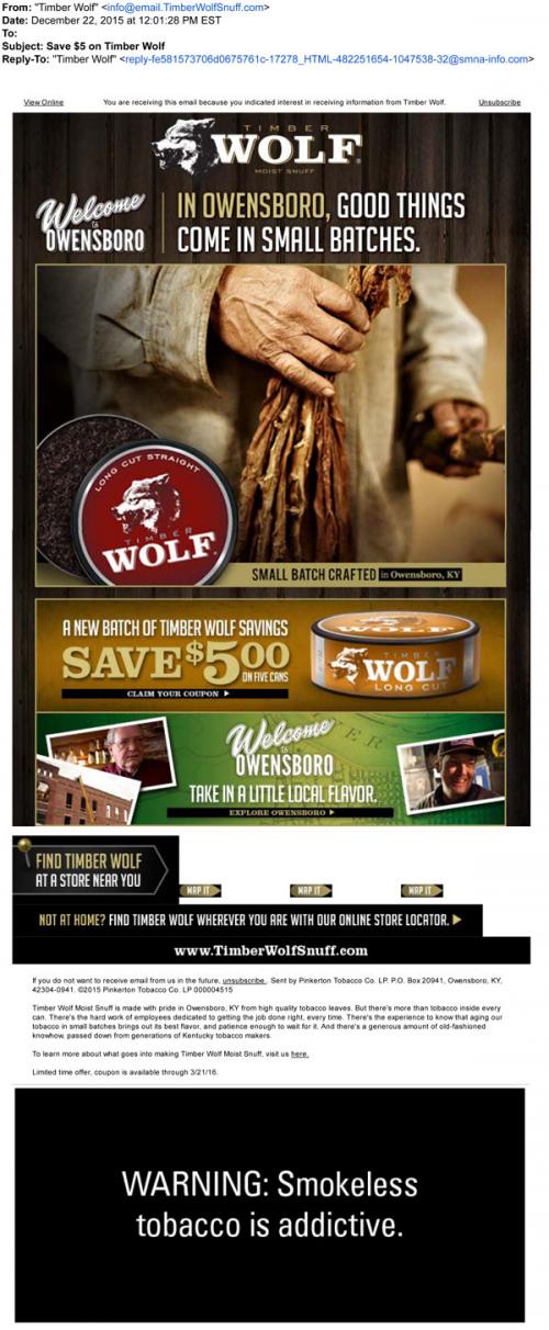 Timber Wolf email from December 2015 linking to the brand website to claim coupons, learn about the town in Kentucky where their products are made, and find a retail location.