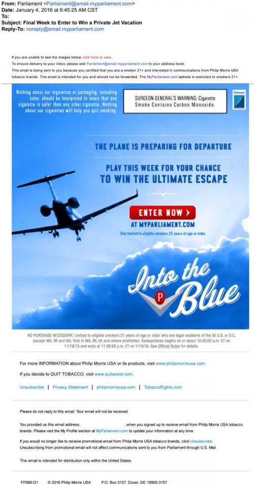 Email from Parliament in January 2016 announcing the last week of the Into the Blue sweepstakes and reminding the recipient to enter on the brand website; a link is provided.
