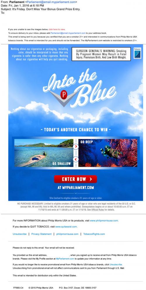 Email from Parliament in January 2016 reminding the recipient to enter the Into the Blue sweepstakes and providing a link to the brand website for that purpose.