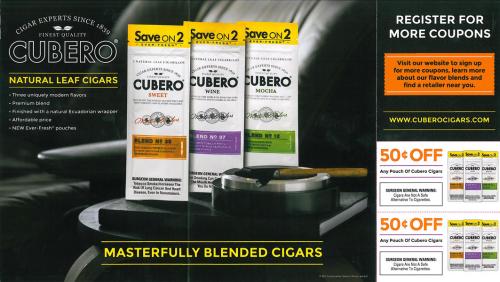 Direct mail received from Cubero cigars in January 2016 containing coupons. The direct mail piece promotes the sweet, wine and mocha flavored cigars.