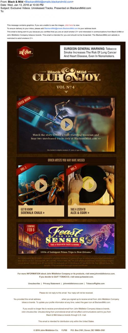 Email from Black & Mild in January 2016 promoting recent videos about various musicians on the brand website. Also announces an upcoming sweepstakes, Feast for the Senses, which will feature many prizes and trips to New Orleans.