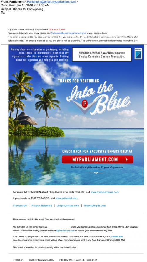 Email from Parliament in January 2016 thanking the recipient for participating in the Into the Blue sweepstakes. Links to the brand website for further offers.