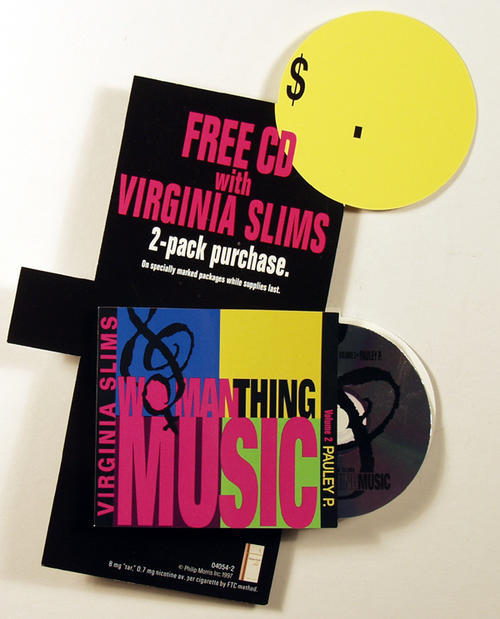 Free CD with Virginia Slims 2-pack purchase. Virginia Slims & Women Thing Music Vol. 2 Pawley P. cardboard display.