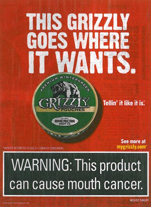 Grizzly ad featuring pouches as part of the "Tellin' it like it is" series; suggests flexibility of the product use in various situations and locations. Text: "This Grizzly goes where it wants."