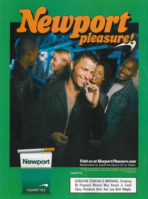 Newport ad featuring a mixed gender and multi-ethnic group of people smiling at night, with a man putting a cigarette to his mouth in the foreground.