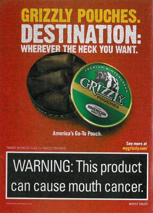 Ad for Grizzly pouches, "America's Go-To Pouch." Promotes product as something that can be used anywhere. Text: "Destination: Wherever the heck you want."