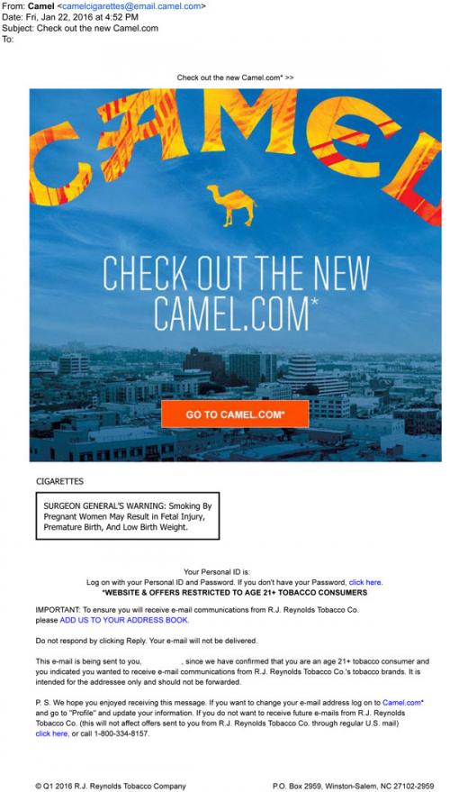 Camel email from January 2016 inviting the recipient to check out the new website design.