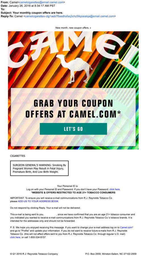 Email from Camel in January 2016 linking to the brand website to claim monthly coupon offers.