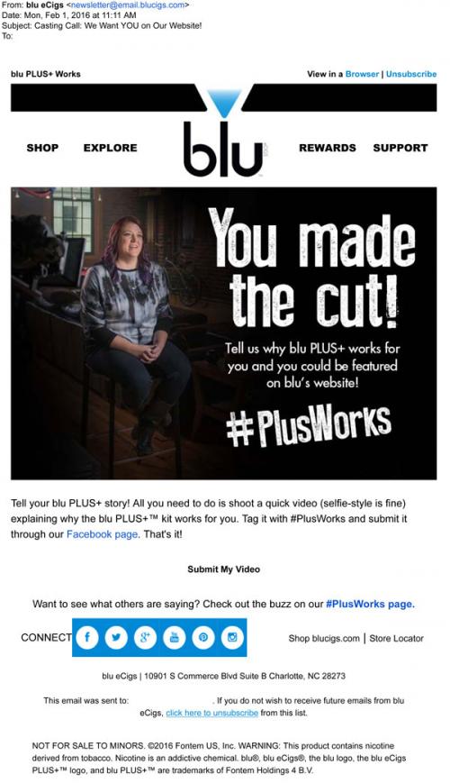 Blu email from February 2016 soliciting video submissions from fans about their blu PLUS+ kit. The videos have the chance to be featured on the brand website. Includes instructions for submissions and a link to check out other videos.