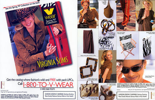 Virginia Slims V Wear Spring '97 collection sign. Catalog items shown on the back along with pack UPC value.