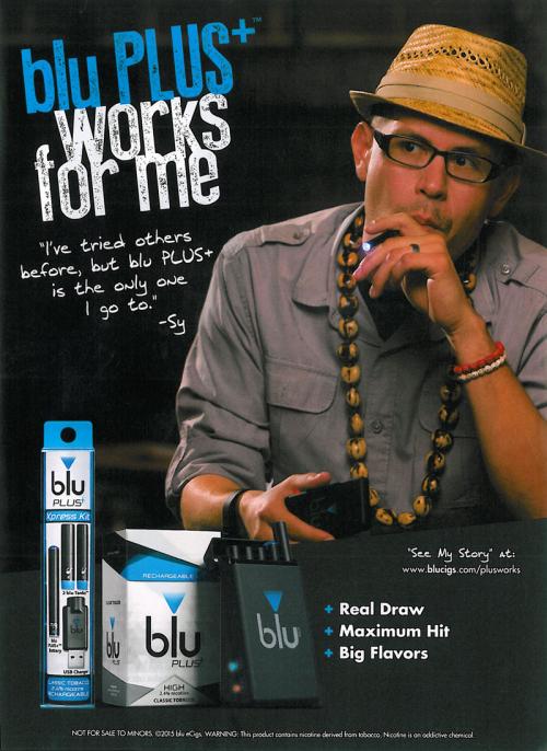 Ad from the "Blu PLUS+ works for me" series. Sy says, "I've tried others before, but blu PLUS+ is the only one I go to." Shows him actively using the e-cig product.