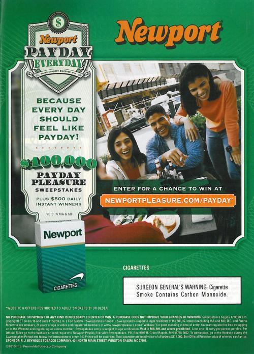 Newport ad promoting the Payday Pleasure sweepstakes, with instant winners daily. Includes a link to the brand website and directions to enter the contest.