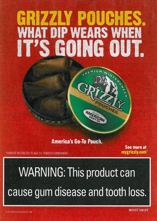 Grizzly ad promoting their pouch products. Text: "Grizzly pouches. What dip wears when it's going out."