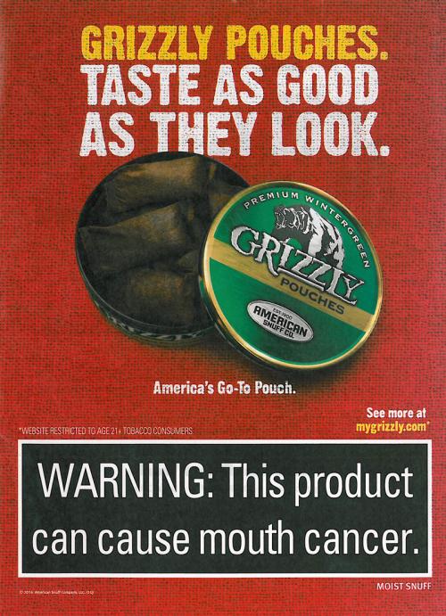 Grizzly ad promoting their pouch products. Text: "Grizzly pouches. Taste as good as they look."