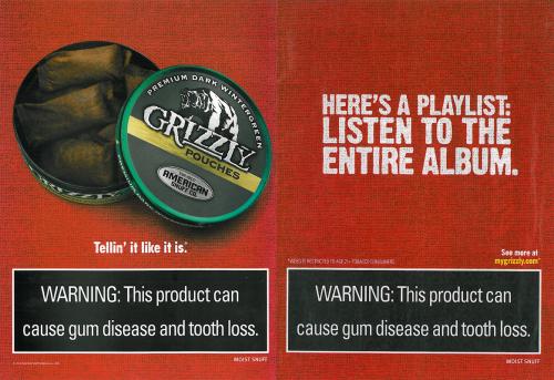 2-page Grizzly ad from the "Tellin' it like it is" series that also highlights their pouch products. Text: "Here's a playlist: Listen to the entire album."